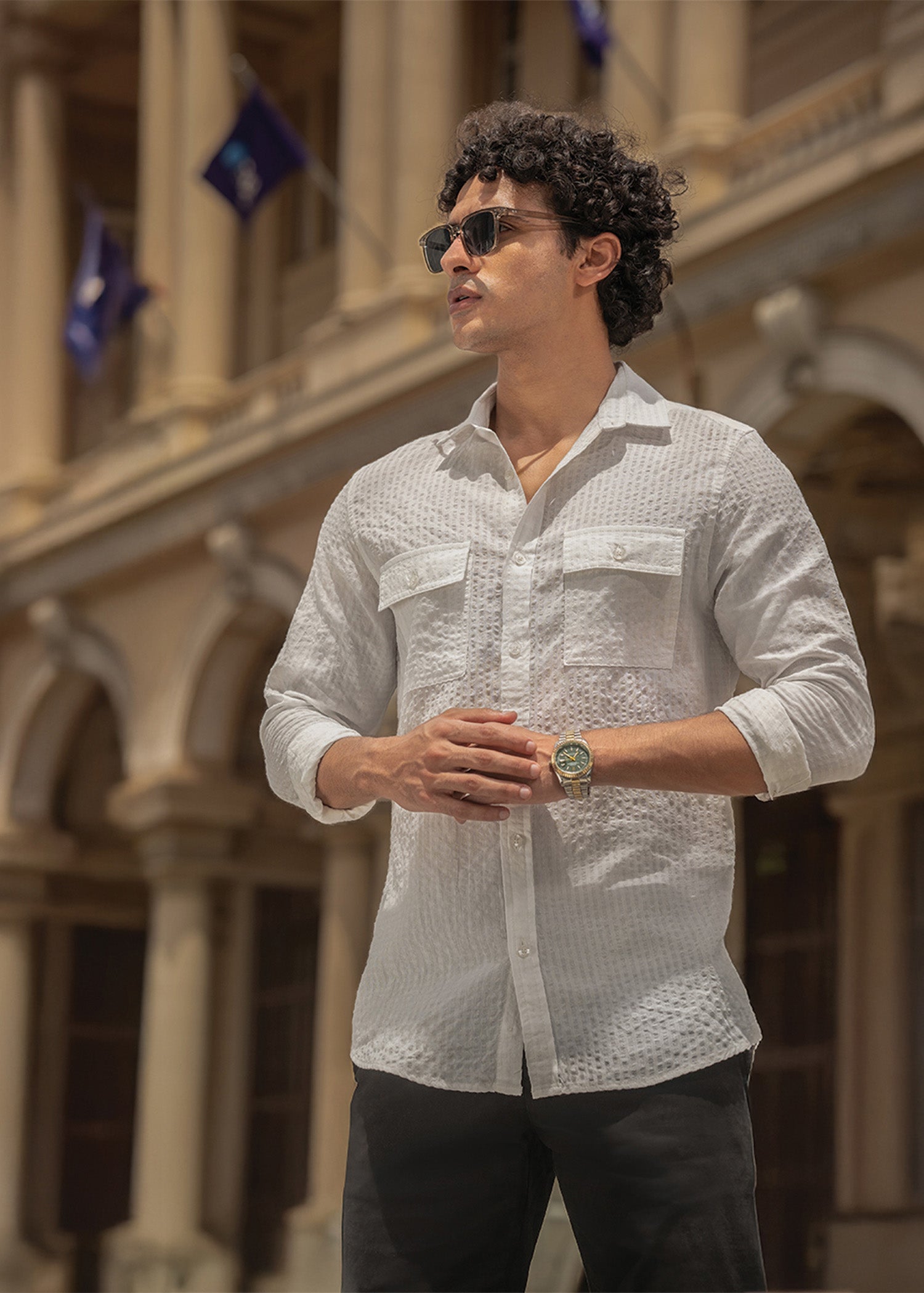Breathe easy in effortless style with the **Seersucker Double Pocket Long Sleeve Shirt**, crafted from **100% cotton seersucker** — a lightweight, textured fabric known for its airy comfort and relaxed look. Designed with two functional chest pockets and a crisp structure, this shirt blends laid-back charm with practical utility, perfect for warm-weather layering or easygoing daily wear.