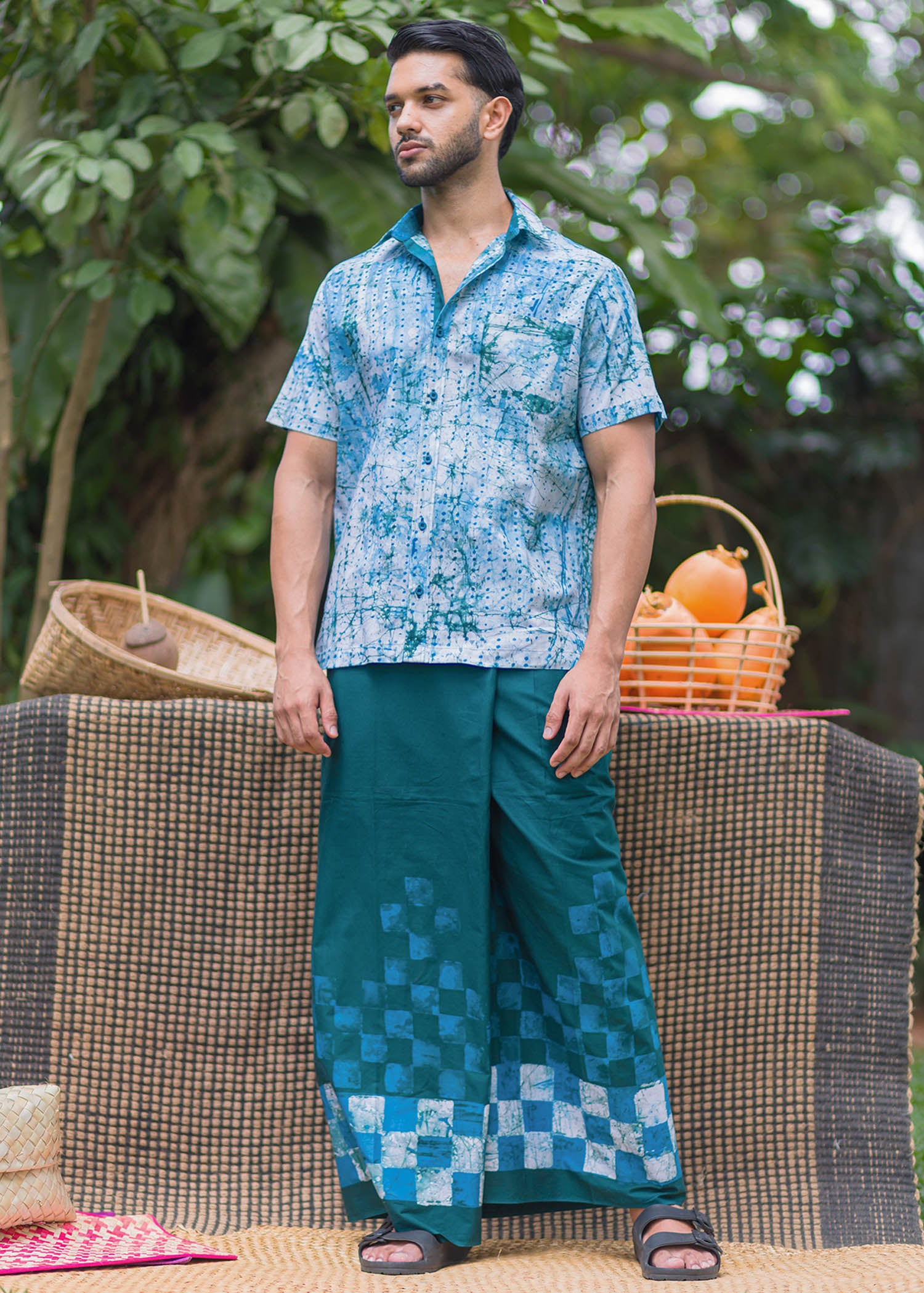 Model wears size L. Made of cotton. Batik white shirt with blue dots and patches for occasion wear. Gives you a classy look. Disclaimer - Colors may slightly vary from the picture.