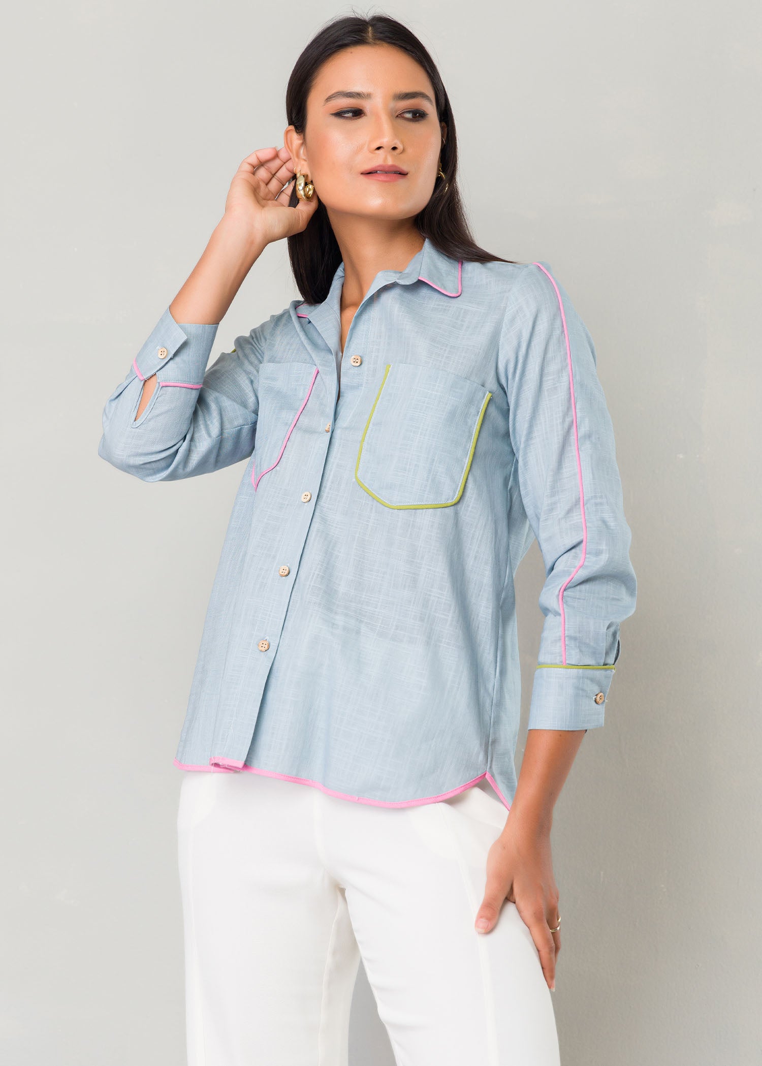 Model wears size 8. Made of Cotton blend. Contrast piping detailed shirt for casual wear. Super comfortable to wear and gives you a classy look. Disclaimer - Colours may slightly vary from the picture.