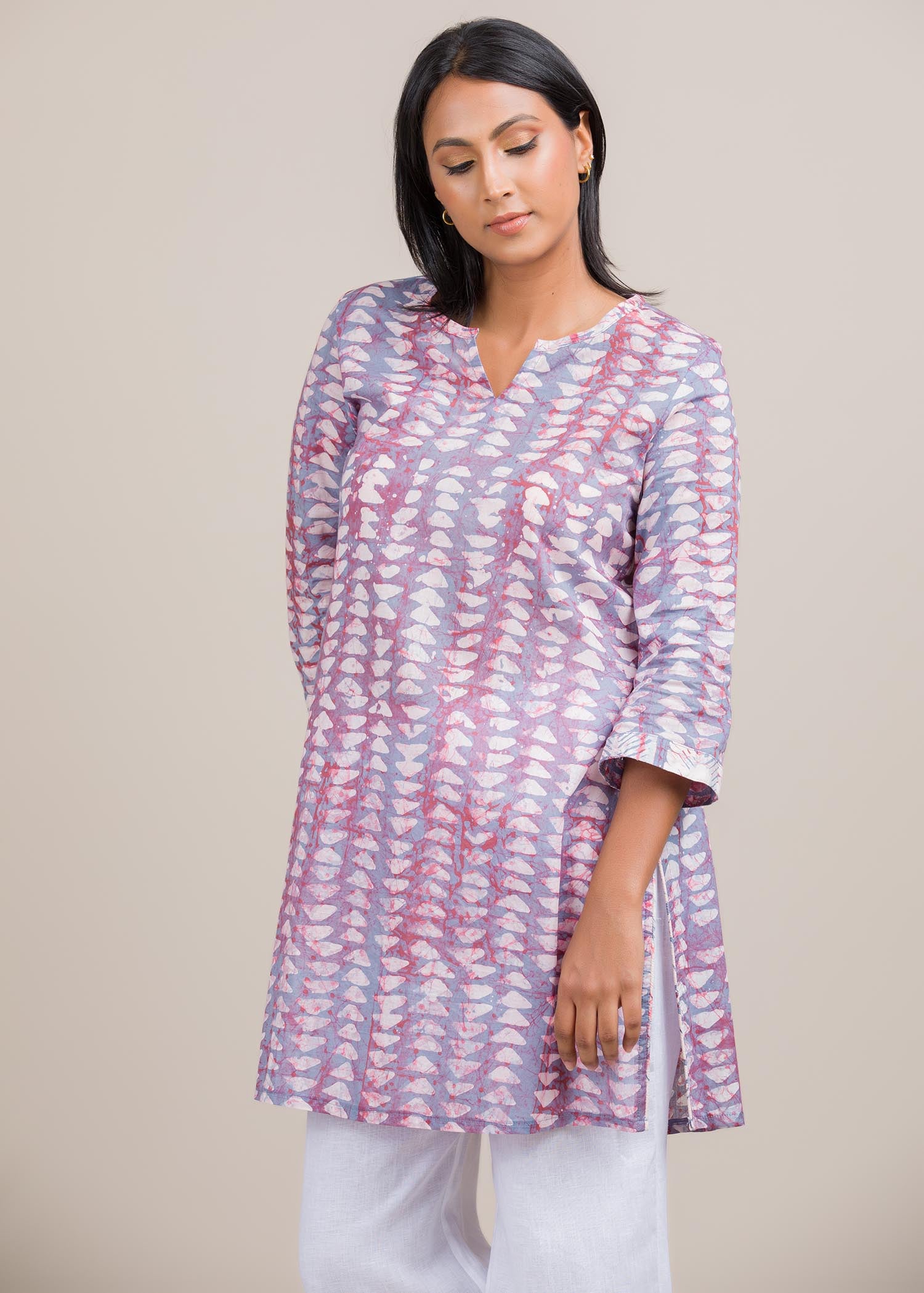 Model wears size 8. Made of Cotton. batik kurtha top with cuff detailed for casual wear. Super comfortable to wear and gives you a classy look. Disclaimer - Colours may slightly vary from the picture
