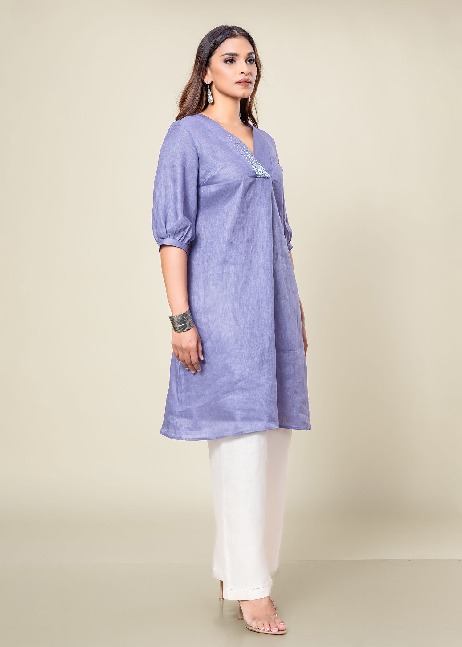 Hand embroidered V-neck linen kurtha top crafted for everyday elegance. Lightweight and breathable, it offers a refined yet comfortable style.