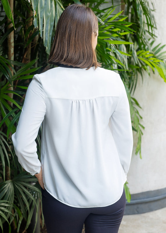 Mandarin collar long sleeve blouse with contast piping for Formal wear. Gives you a classy look.