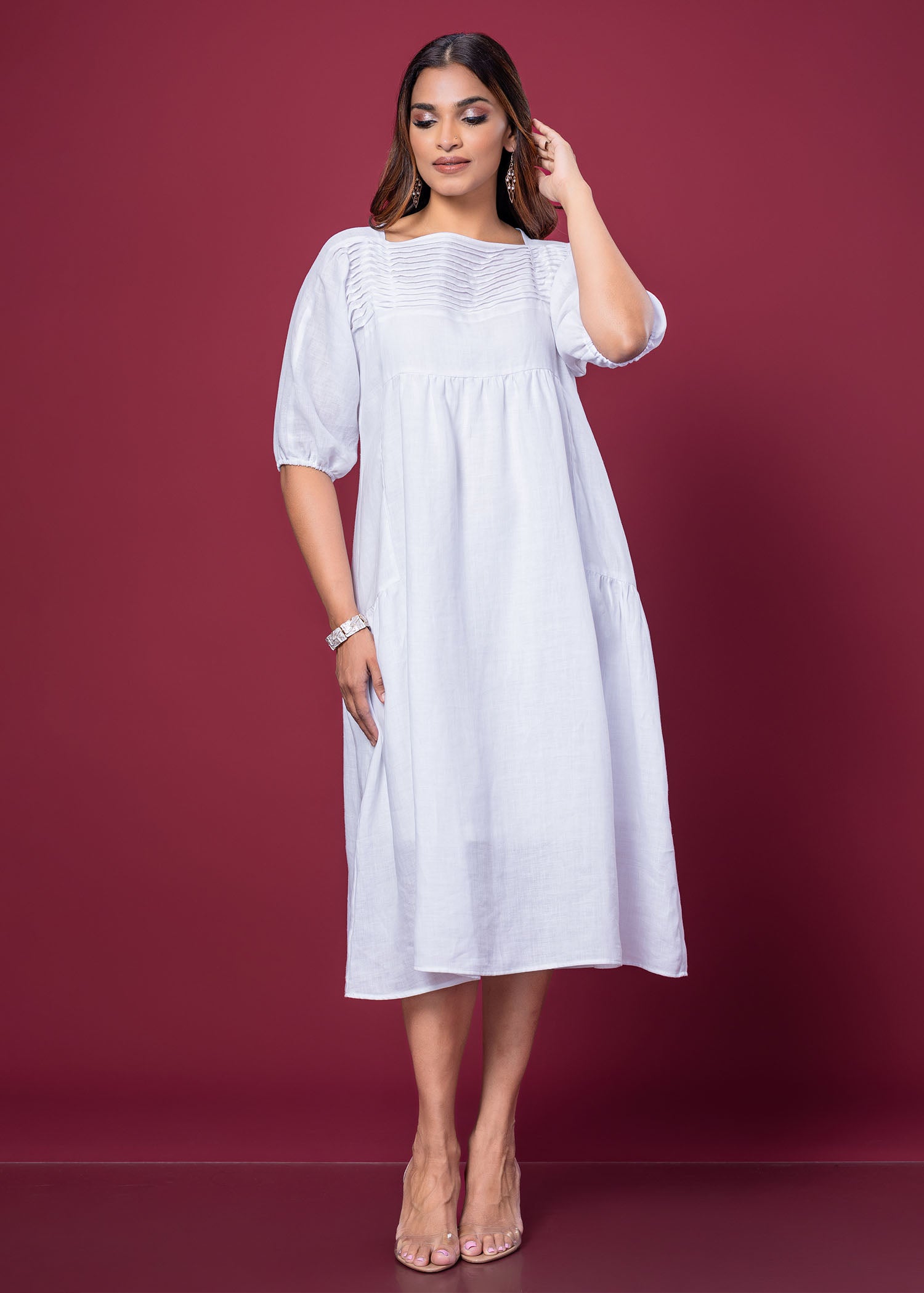 Linen dress with pintuck detailing and side panels, offering a stylish and comfortable casual look.