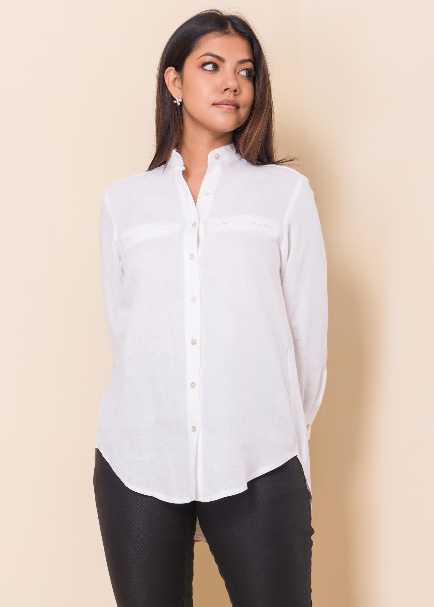 Model wears size 8. Made of Linen blend. Long sleeve linen shirt with welt pockets for casual wear. Gives you a classy look. Disclaimer - Colours may slightly vary from the picture.