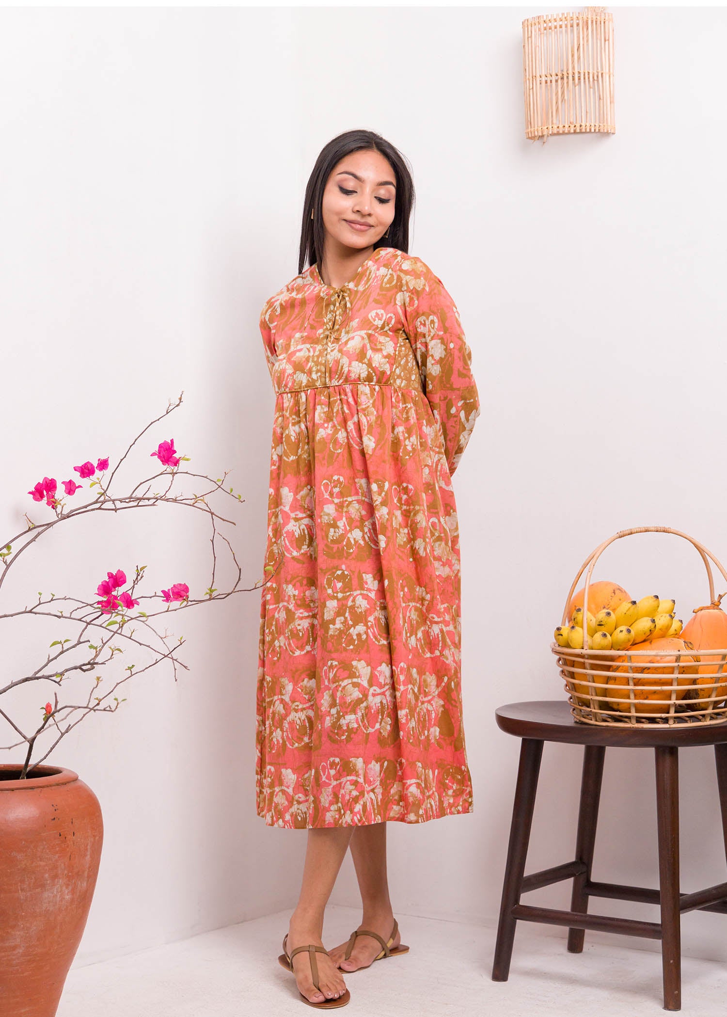 Model wears size 8. Made of cotton. Long sleeved neck tie up batik maxi dress for casual wear. Gives you a classy look. Disclaimer - Colors may slightly vary from the picture.