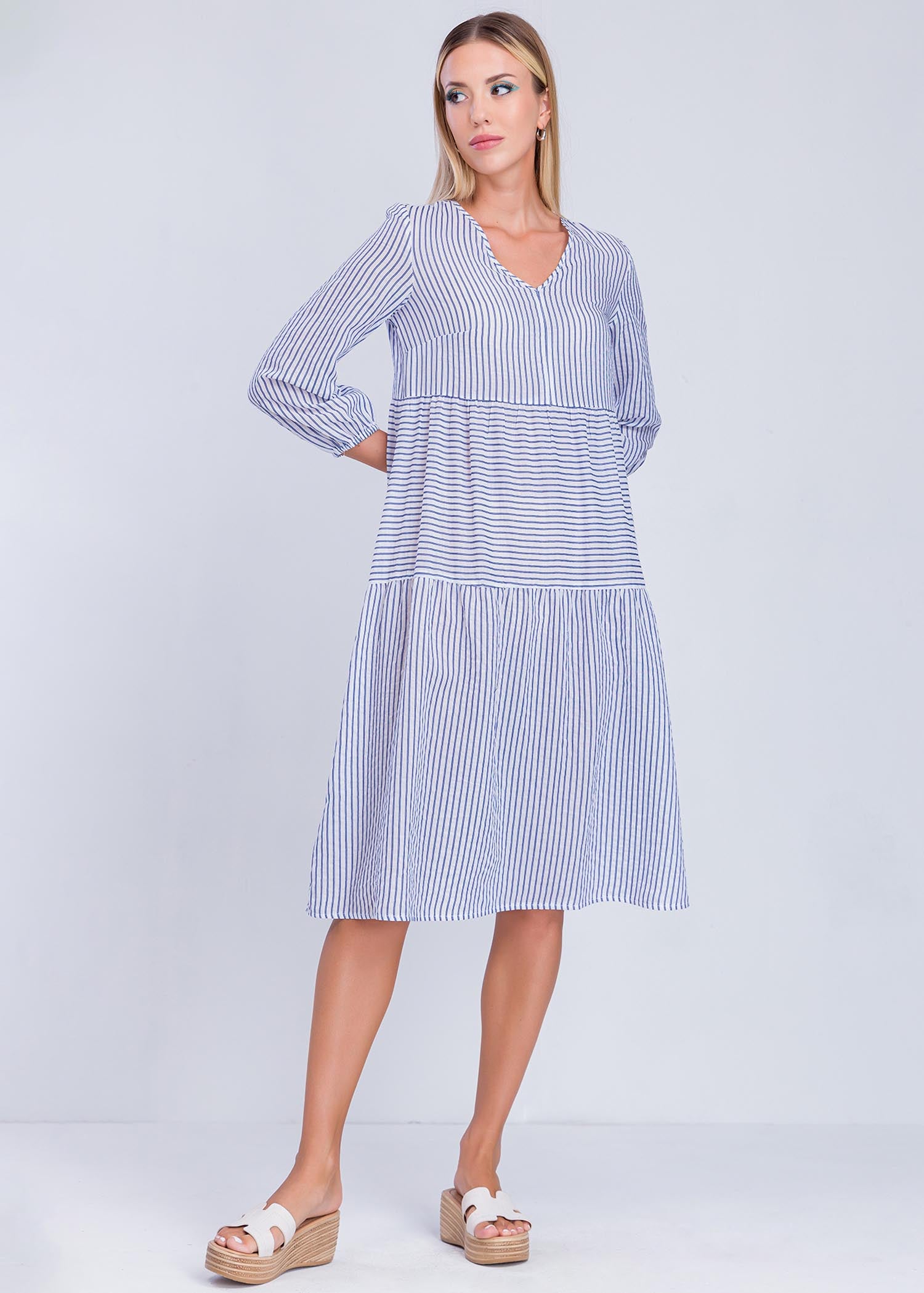 Model wears size 8. Made of Cotton. Tired panel stripe dress for casual wear. Gives you a classy look. Disclaimer - Colors may slightly vary from the picture.