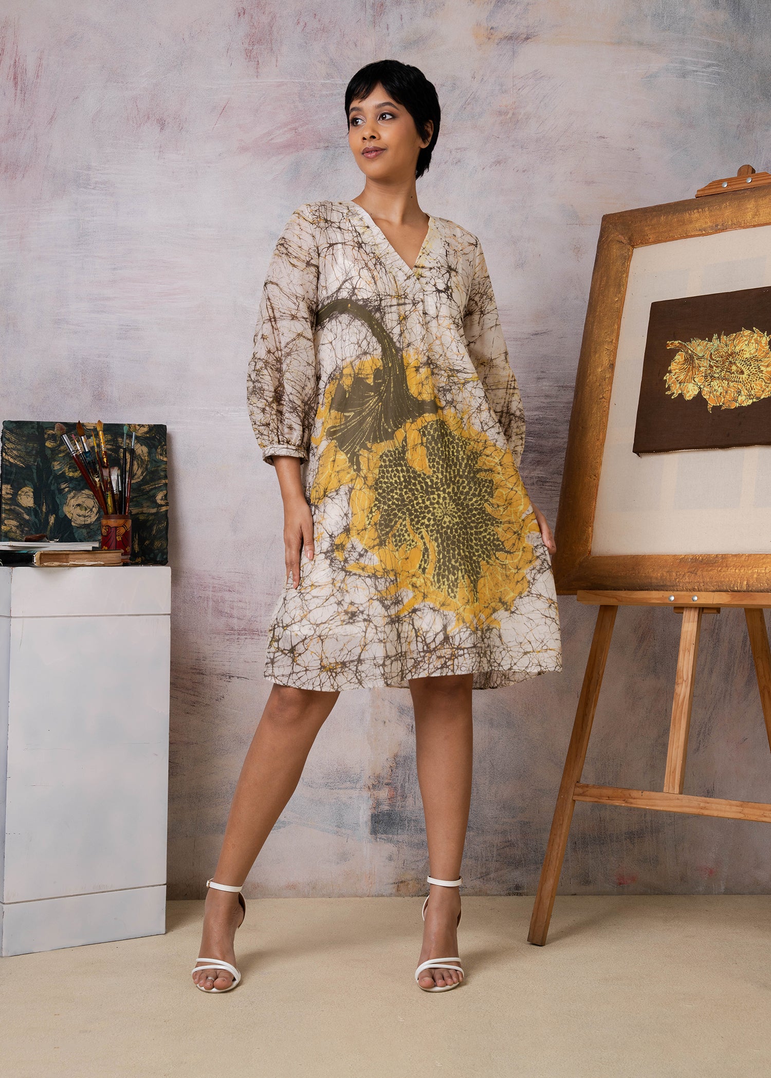 Van Gogh sunflower inspired v- neck puff sleeve dress for Occasion wear. Gives you a classy look.