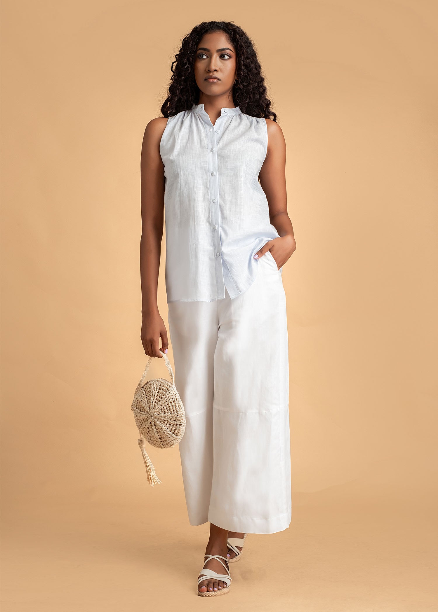 Sleeveless blouse with mandarin collar for casual wear. Gives you a classy look.