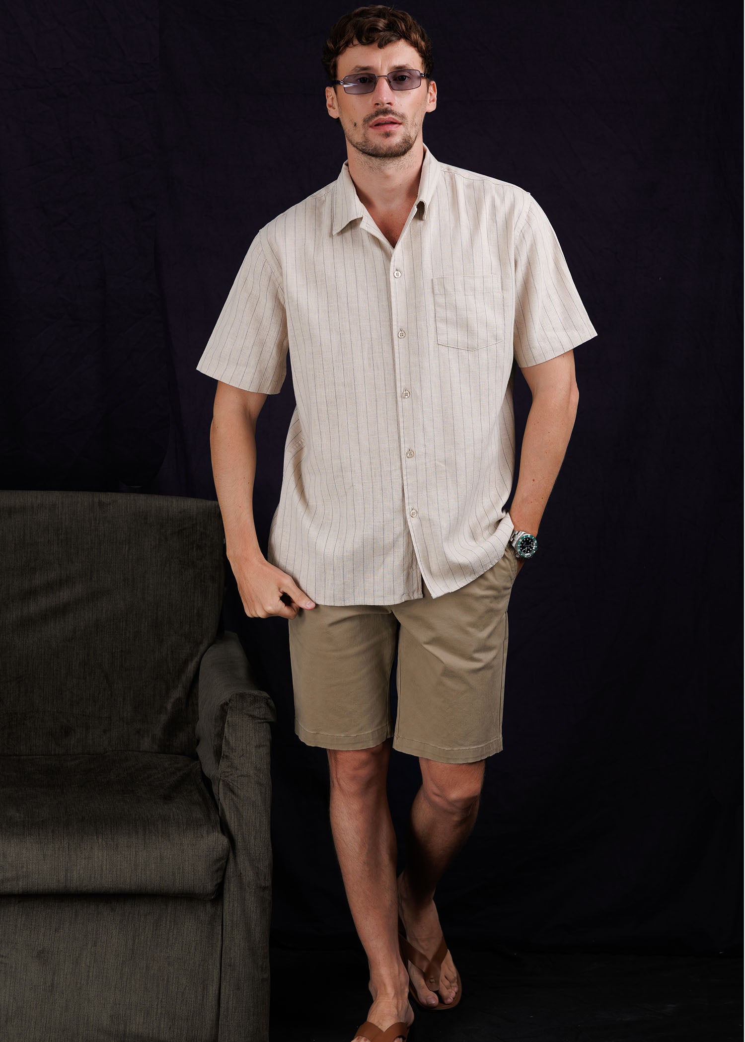 Stay cool and stylish with the Stripe Cuban Collar Shirt, crafted from a blend of linen and cotton. Lightweight, breathable, and naturally textured, this shirt offers all-day comfort while the subtle stripes and classic Cuban collar add a refined, casual look.