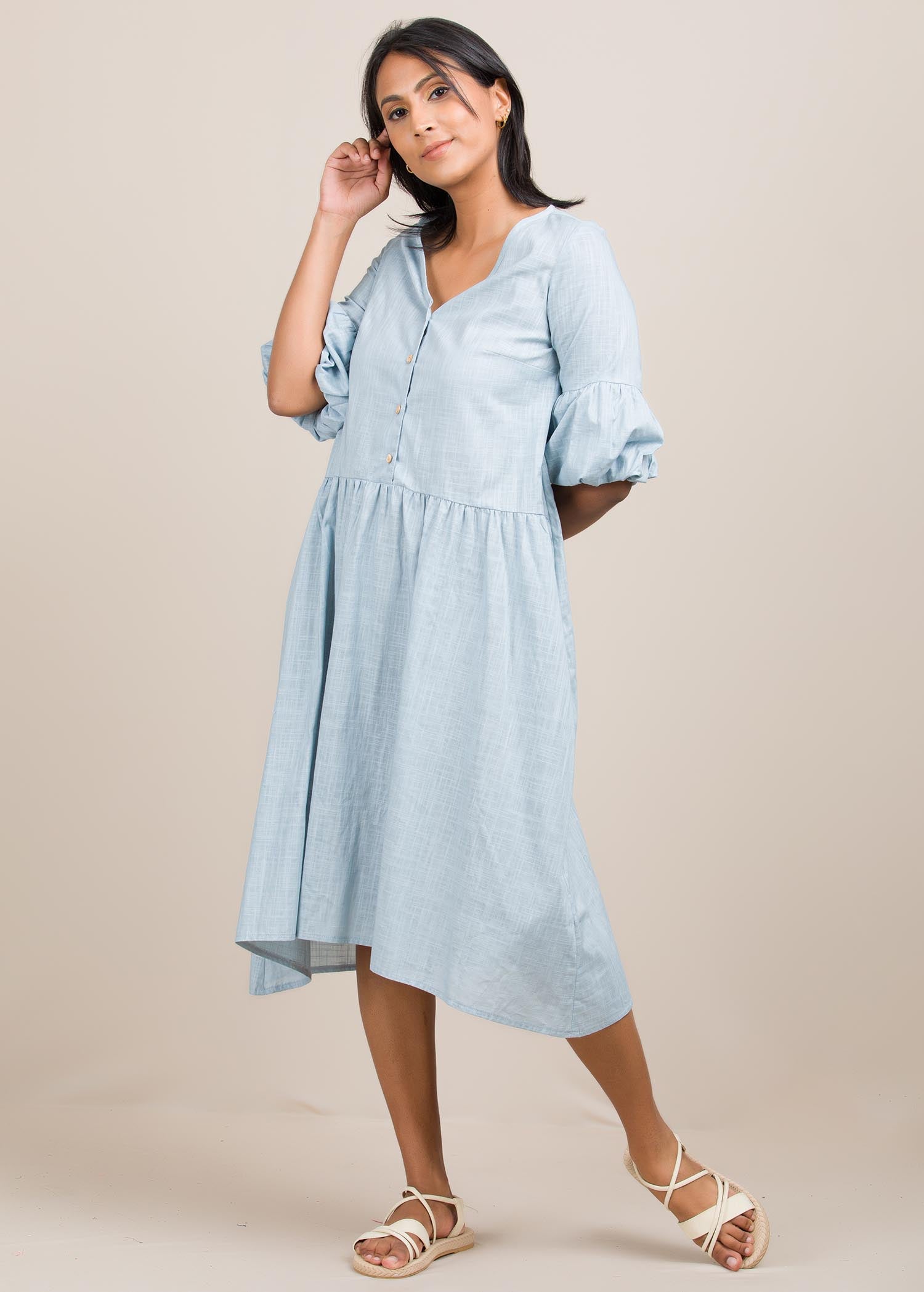 Model wears size 8. Made of Linen blend. Button down dress with puff sleeve for casual wear. Super comfortable to wear and gives you a classy look. Disclaimer - Colours may slightly vary from the picture.