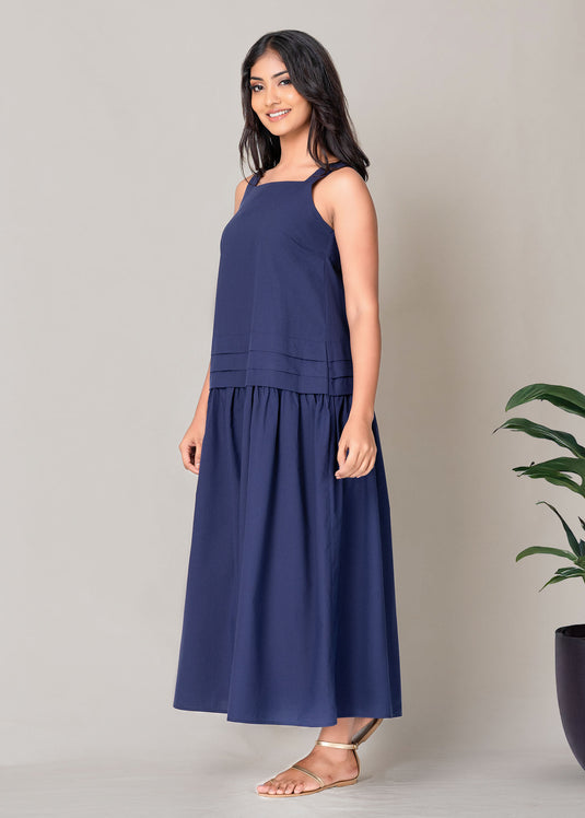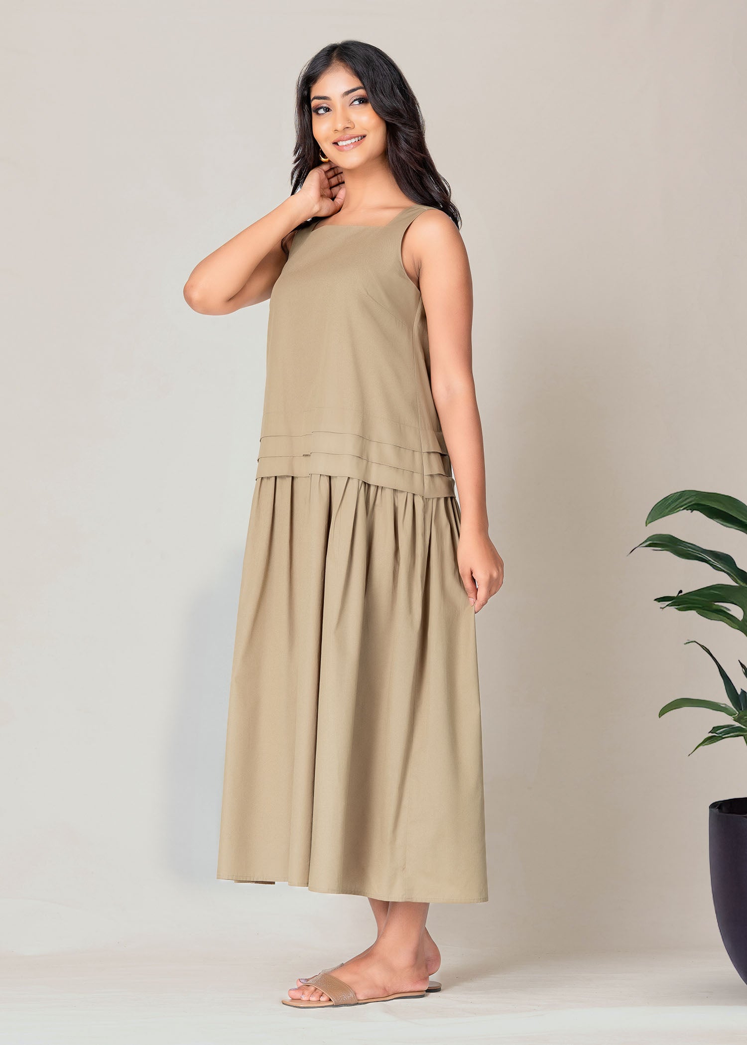 Wide strap midi dress with pleat detail for casual wear. Gives you a classy look.